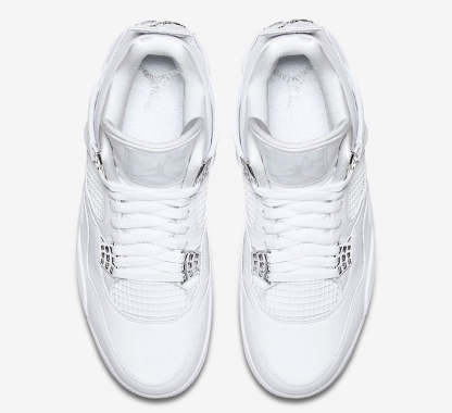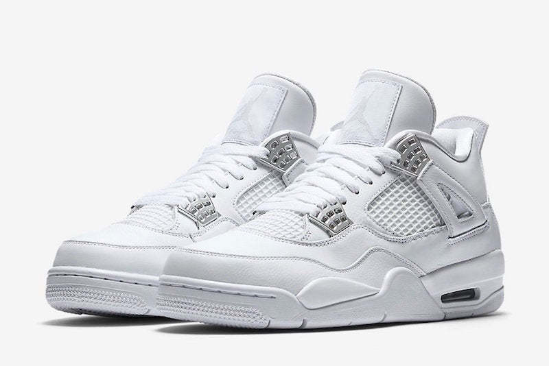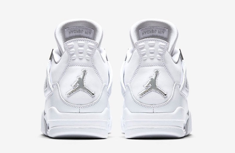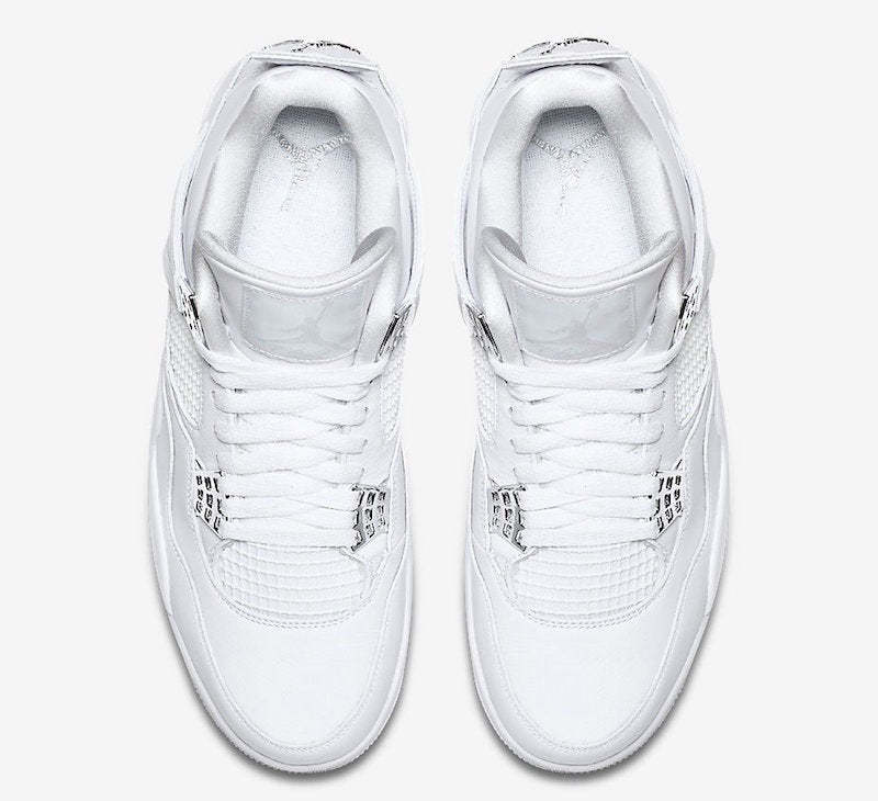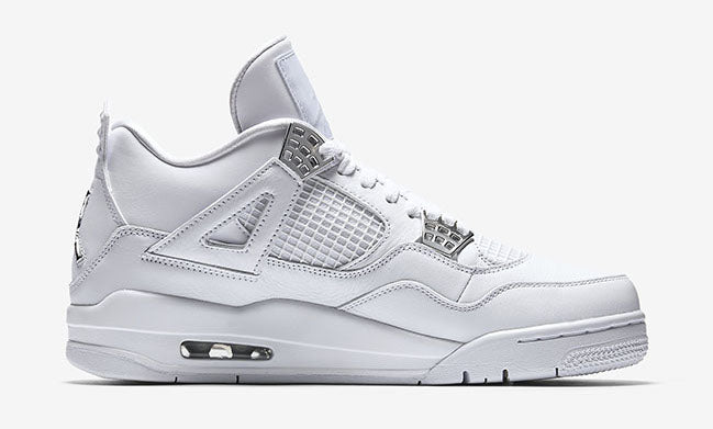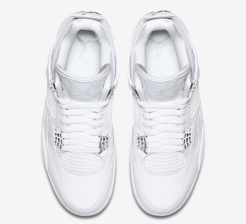 Zapatillas Air Jordan 4 Retro en piel de color blanco y plateado metalizado de jordan con puntera de almendra, cierre con cordones en la parte delantera, parche del logo en la lengüeta, plantilla con logo, acolchado en los tobillos, paneles de malla, logo en el contrafuerte y suela Nike Air.
