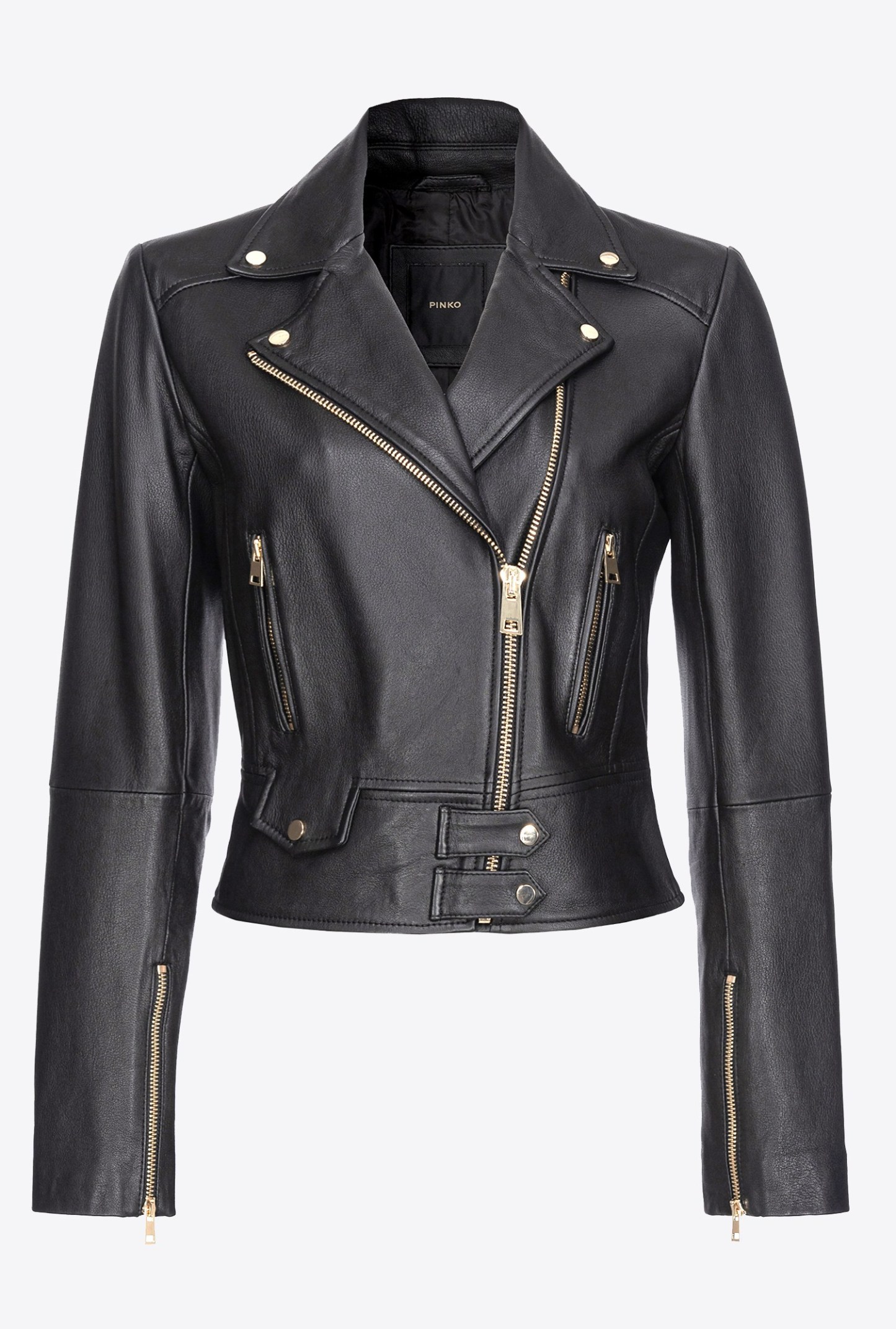 Biker Jacket in Nappa Leather with metallic button details on the collar. Zip pockets, buckles with buttons at the bottom of the garment, and sleeves with zippers and a buckle at the cuffs. Lined with fabric and gold metal hardware. Asymmetric zipper closure. This garment is made with materials from tanneries that promote production in compliance with environmental standards and sustainable business practices.