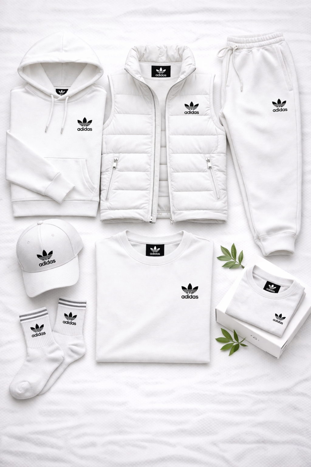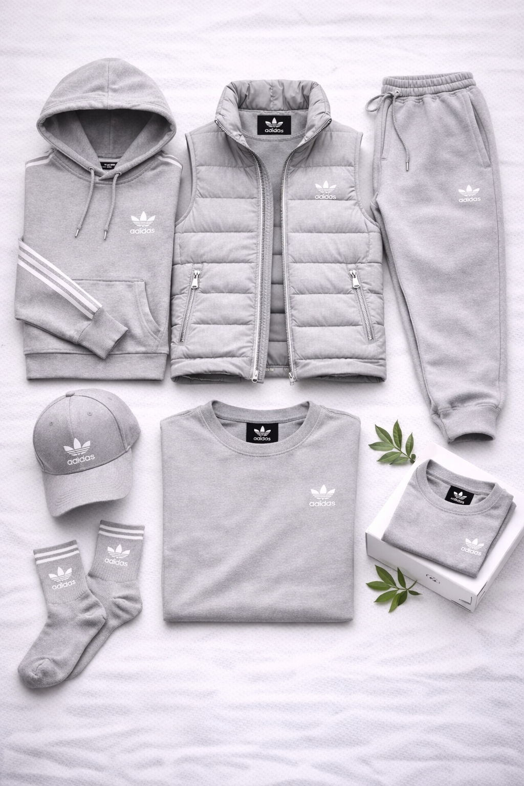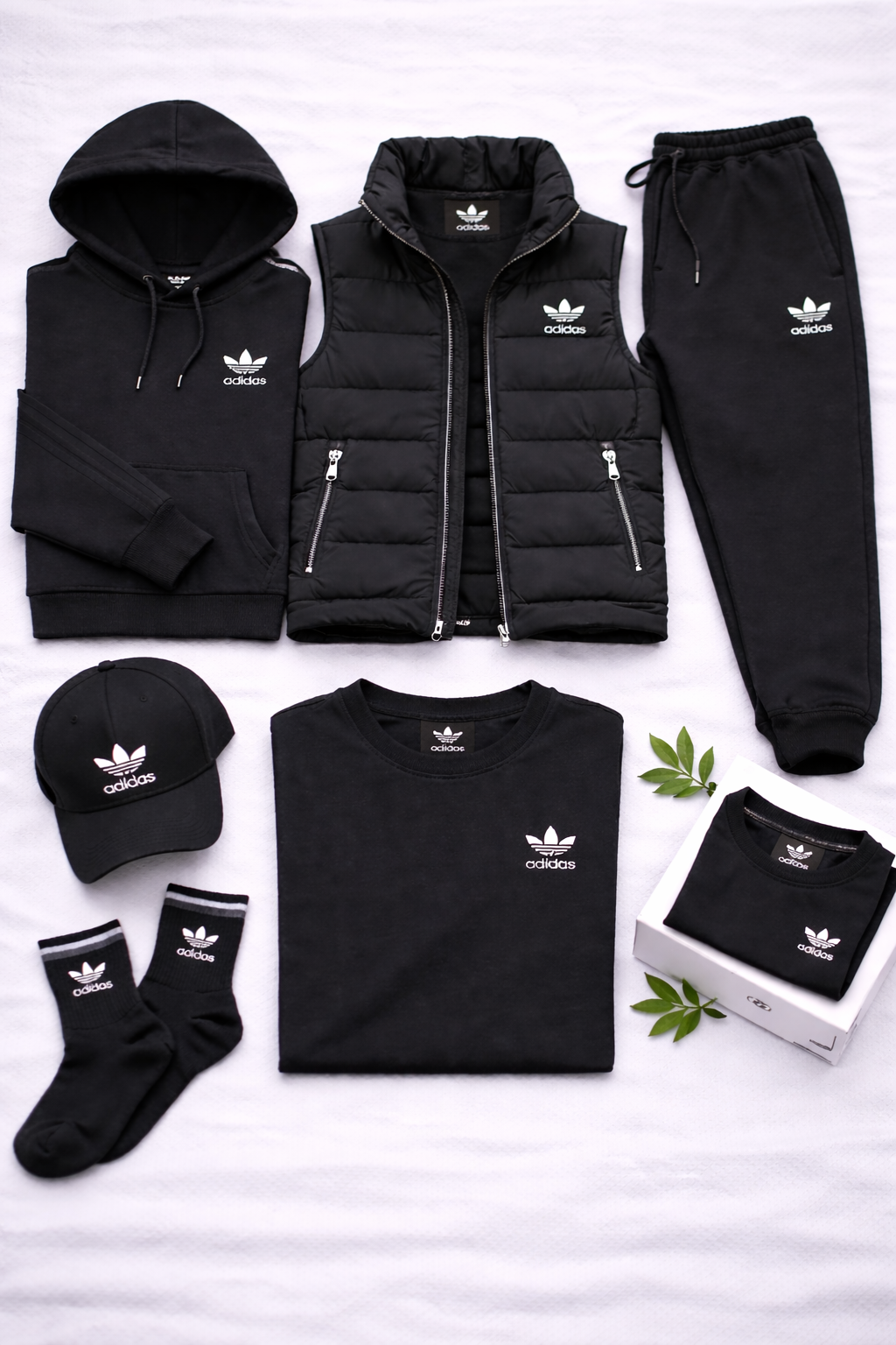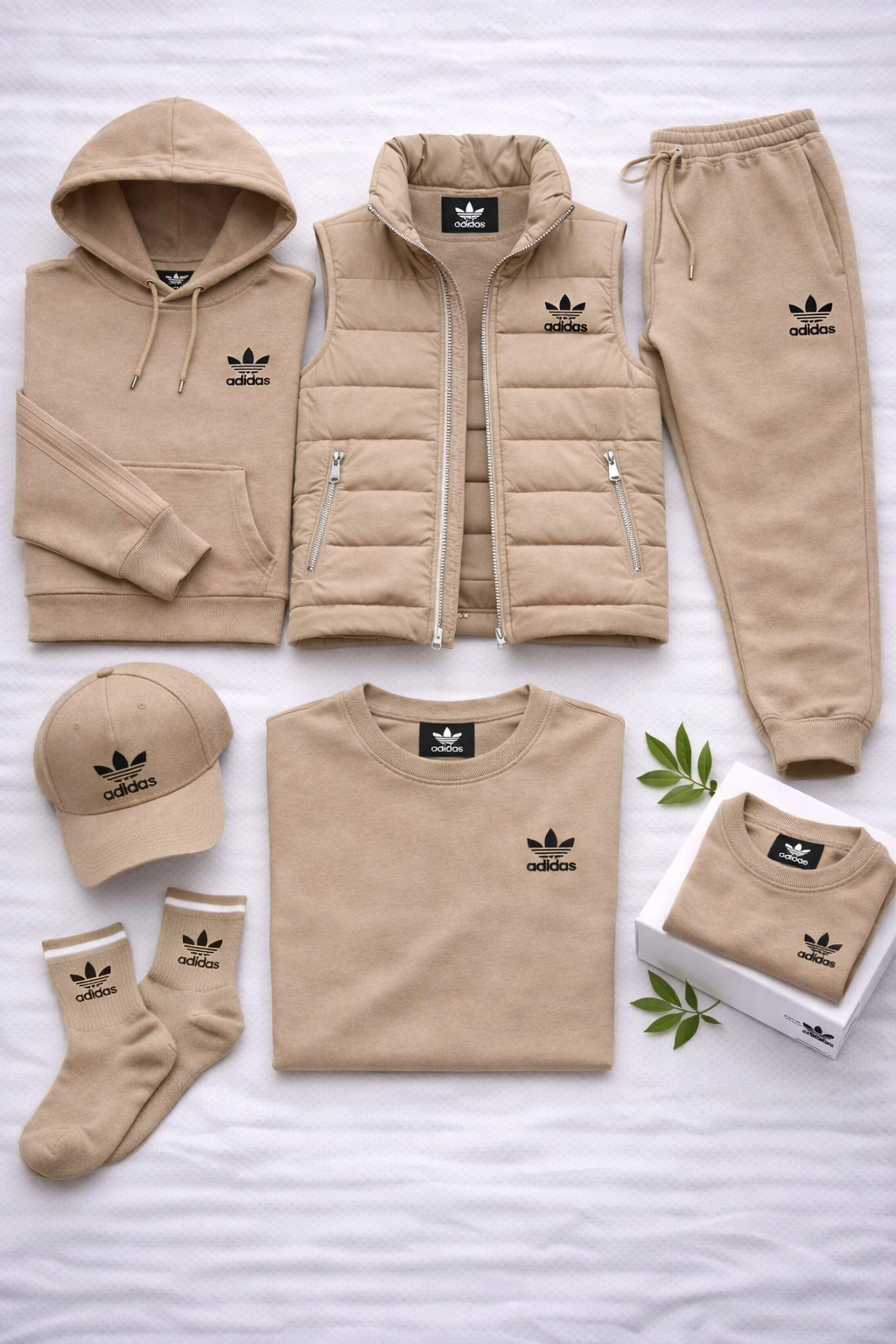 Elle comprend un sweat à capuche, un pantalon de jogging, un gilet matelassé, un t-shirt, une casquette et des chaussettes, tous assortis pour créer un look harmonieux et polyvalent. Le sweat est confortable et structuré, tandis que le pantalon offre une grande liberté de mouvement grâce à sa taille élastiquée et à sa coupe épurée.