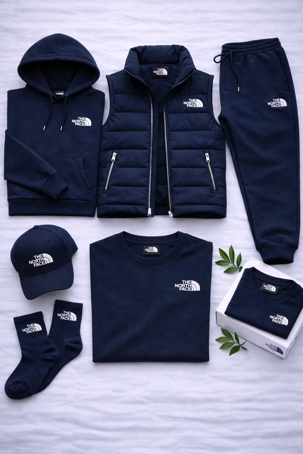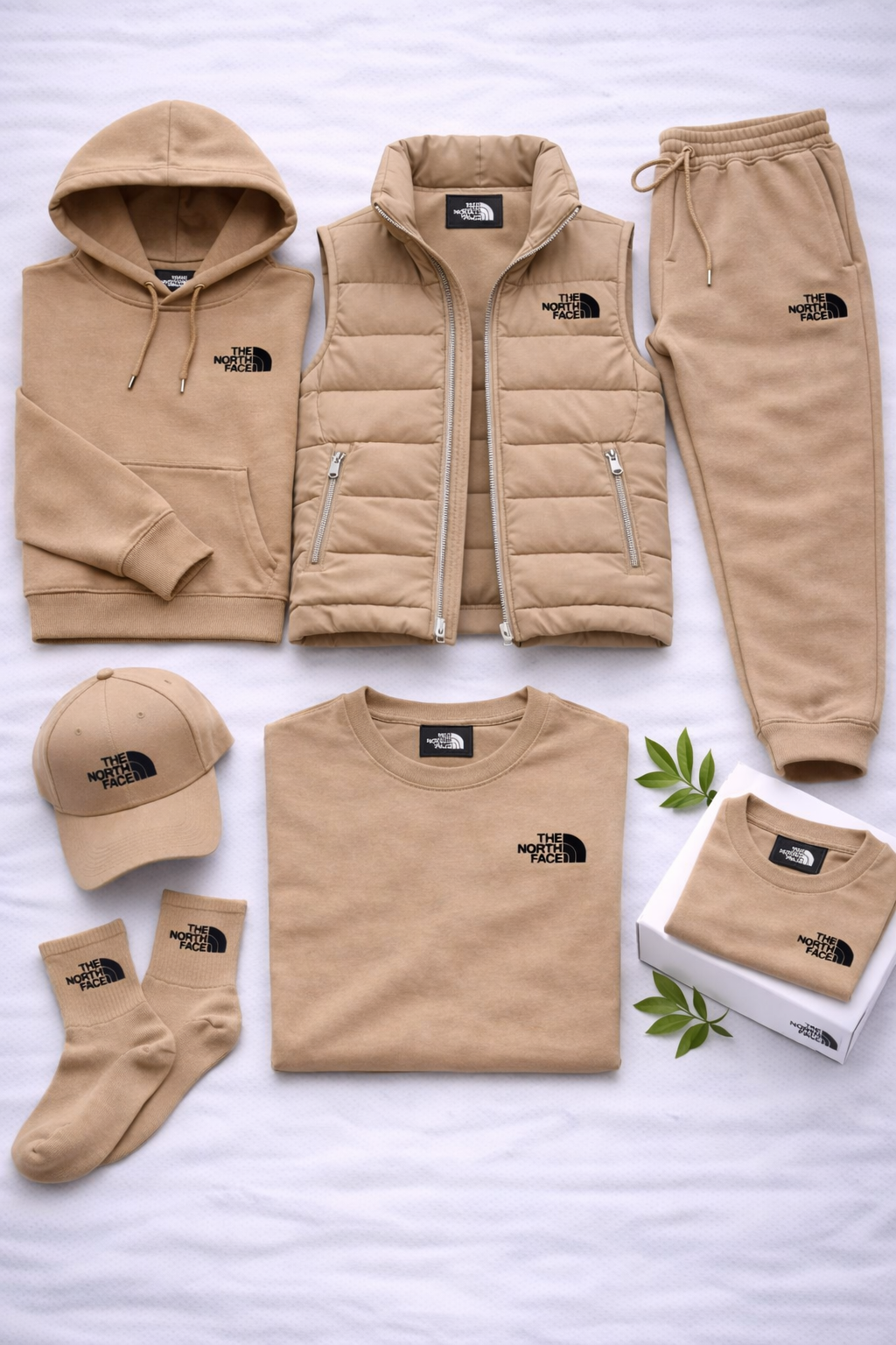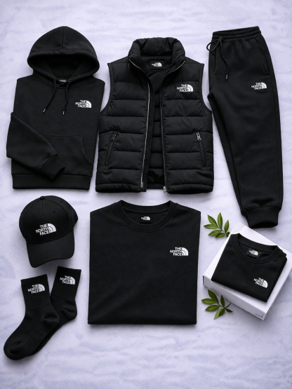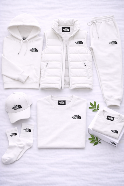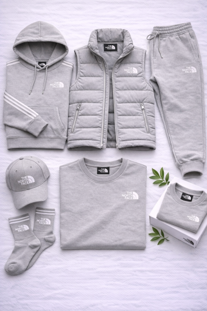 La collection se compose de pièces coordonnées qui s'associent naturellement : sweat à capuche, pantalon de jogging, gilet matelassé, t-shirt, casquette et chaussettes. Chaque élément est conçu pour offrir confort, praticité et une ligne cohérente.