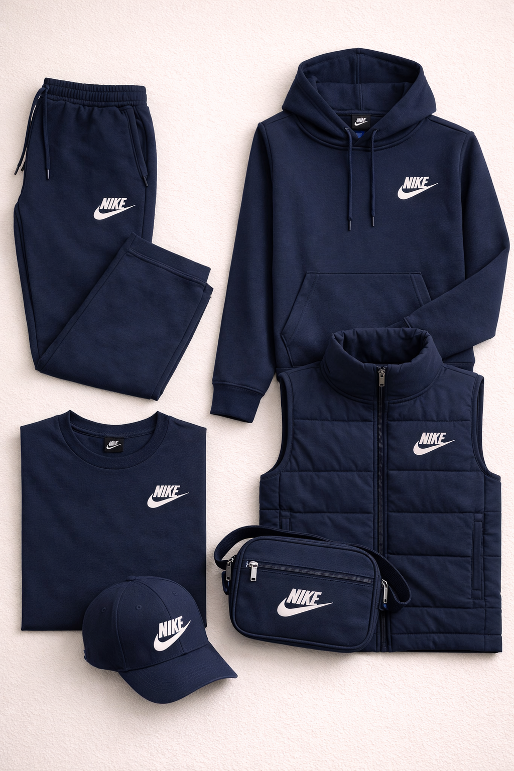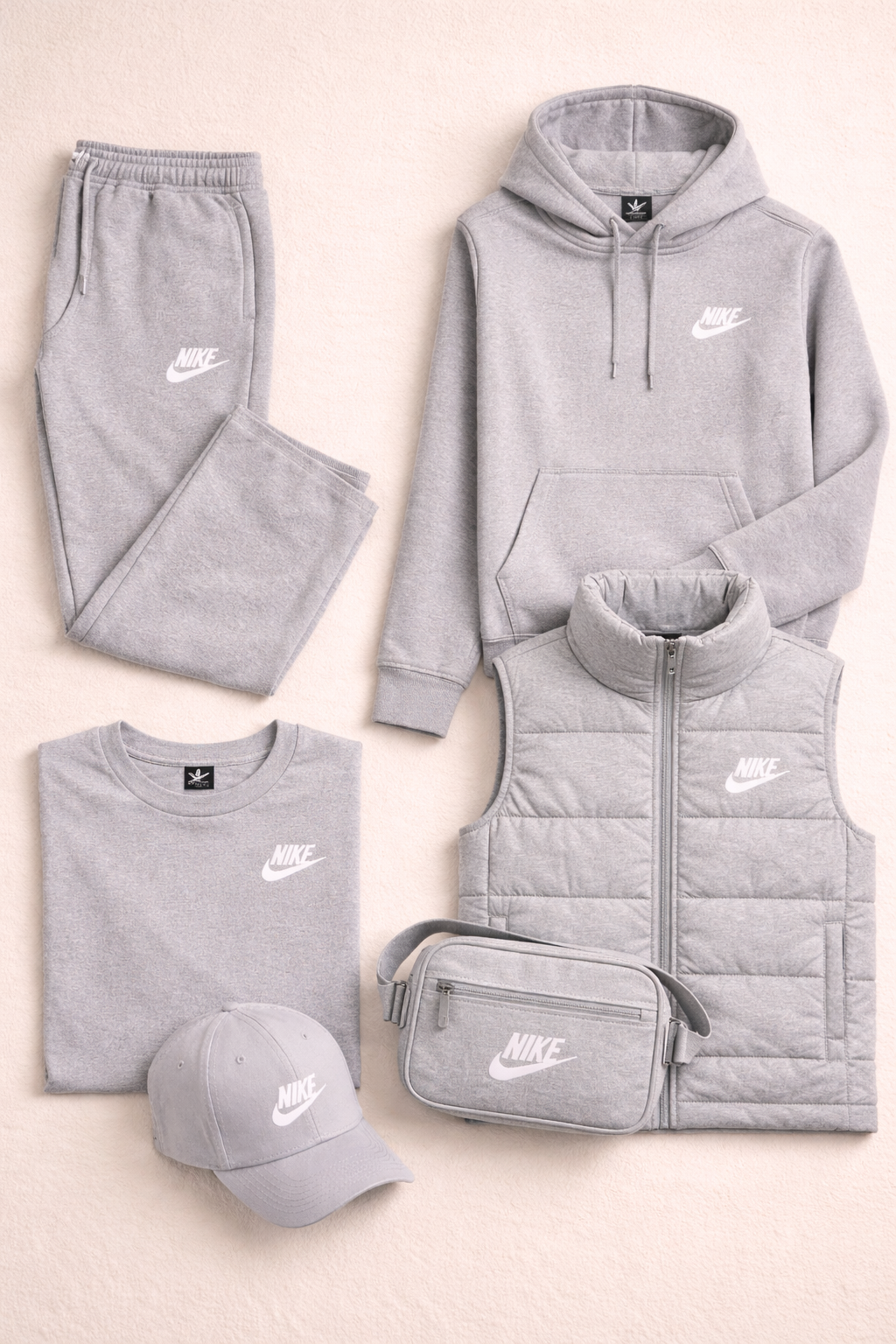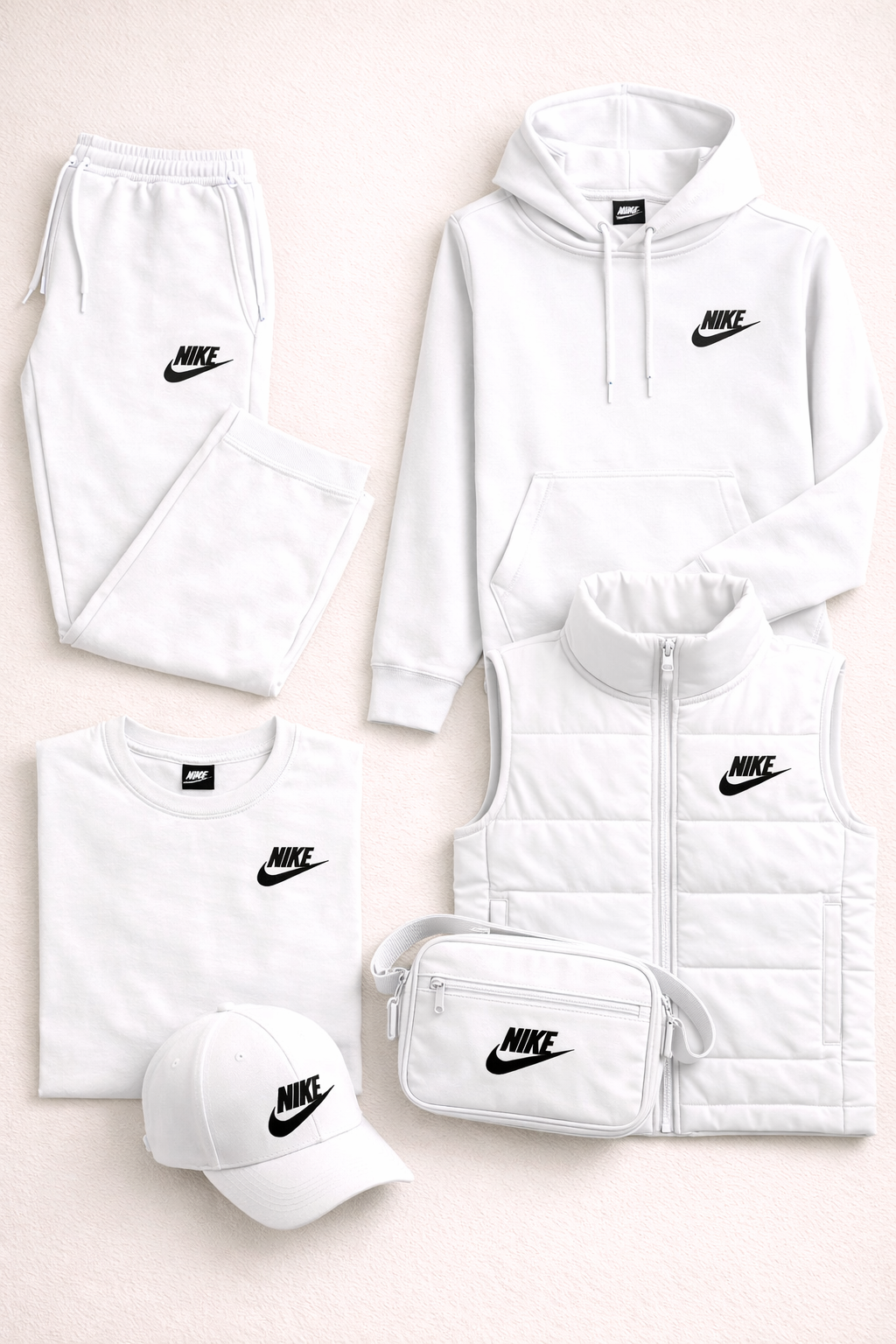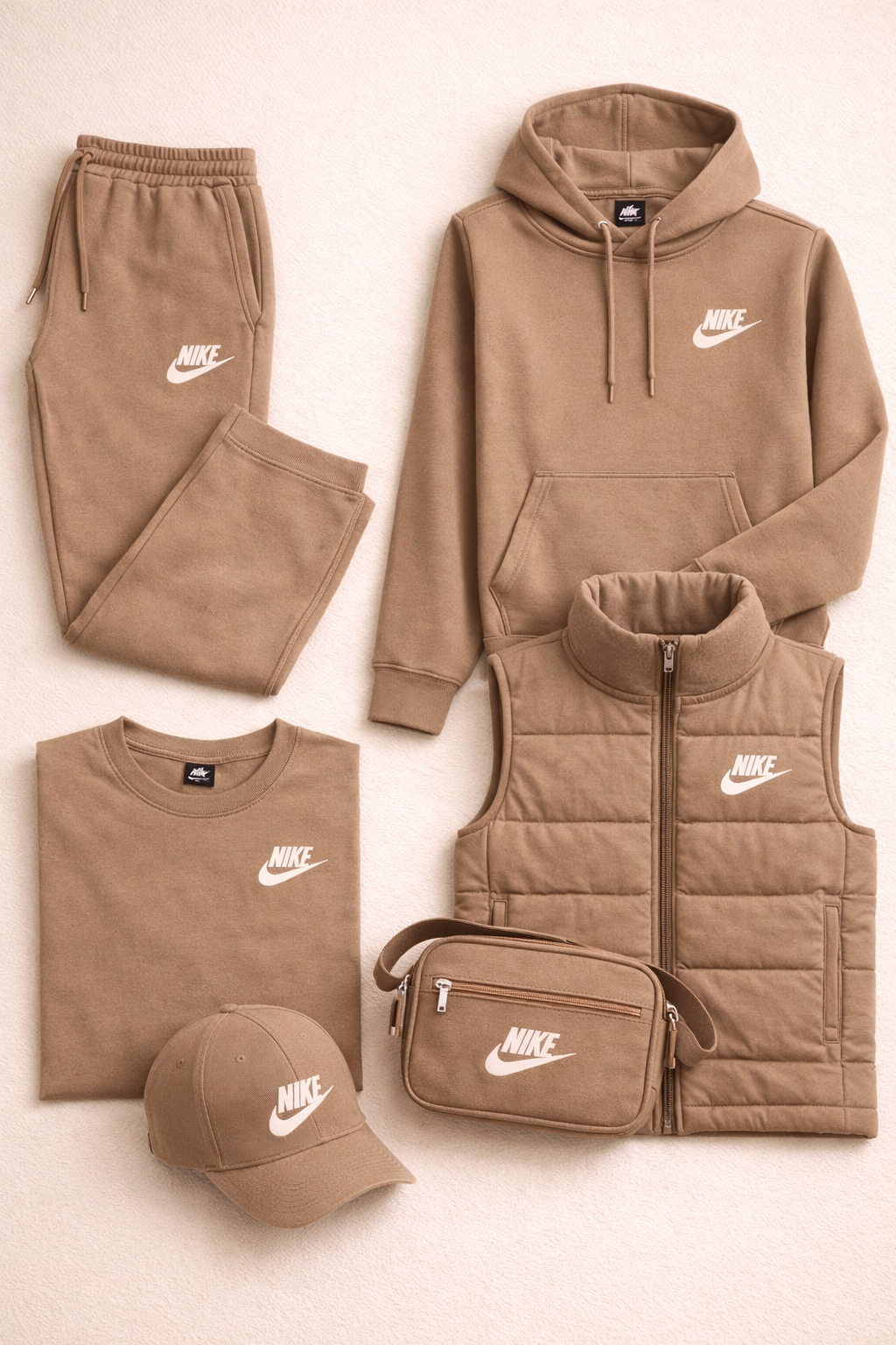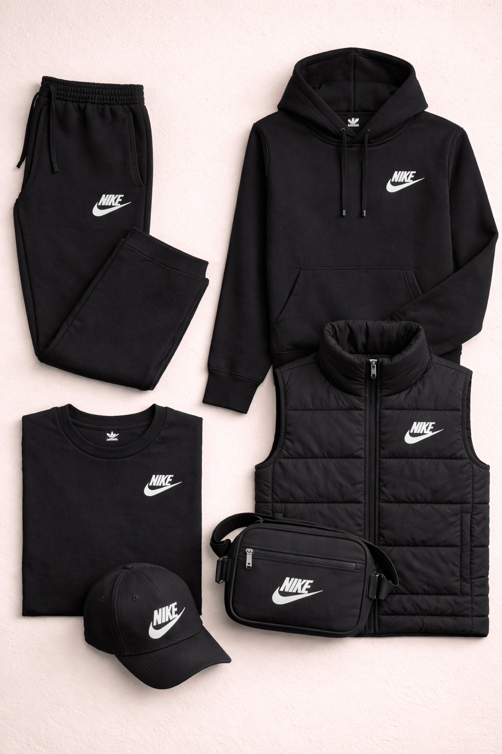 L'ensemble comprend cinq pièces coordonnées : un pantalon de jogging, un sweat à capuche, un t-shirt, un gilet matelassé et une casquette, auxquels s'ajoute un sac à bandoulière compact et pratique. Chaque pièce est conçue pour être portée seule ou combinée aux autres, créant ainsi un look complet et harmonieux.