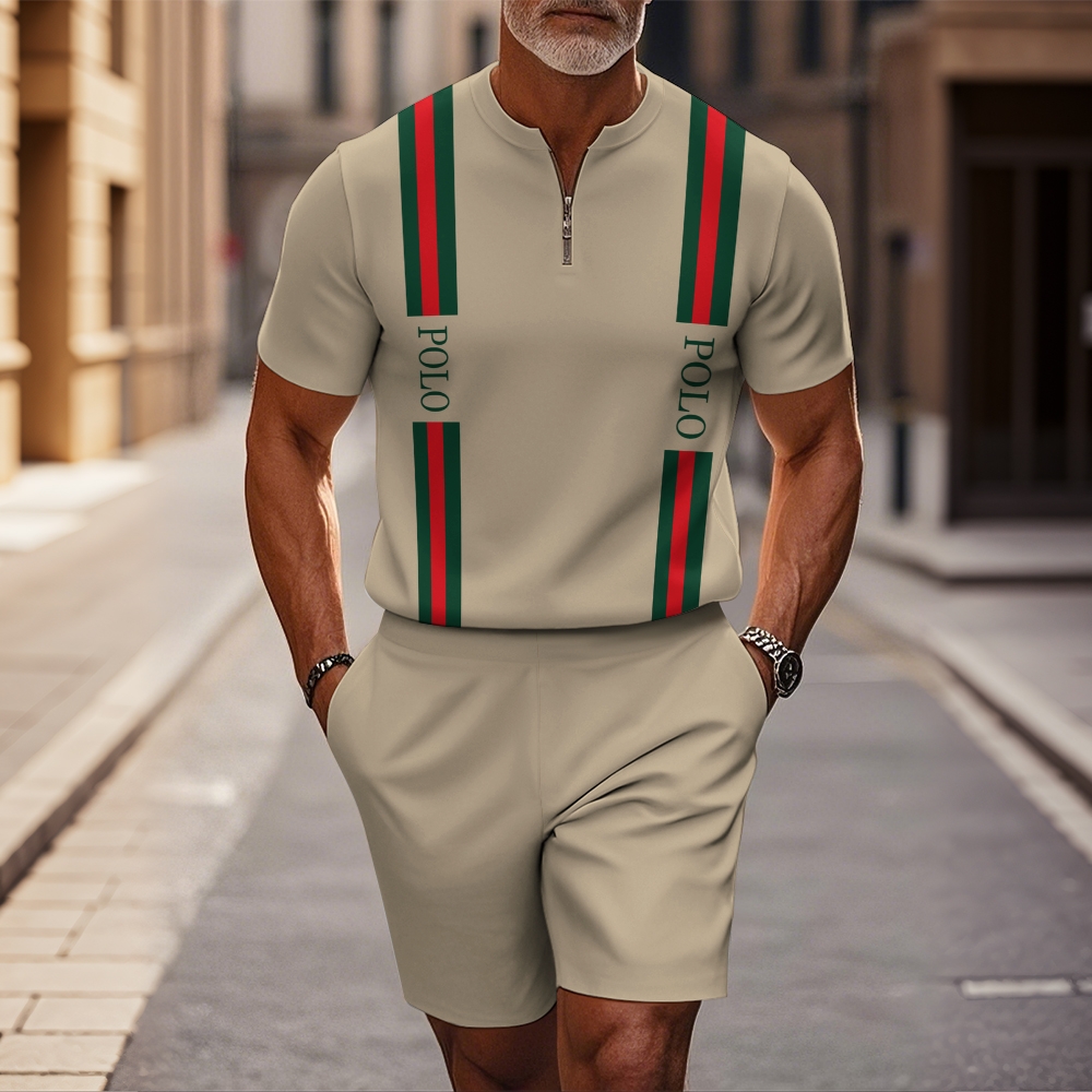Men's fashion casual round-neck zipper geometric printed short-sleeved two-piece set 2503000015