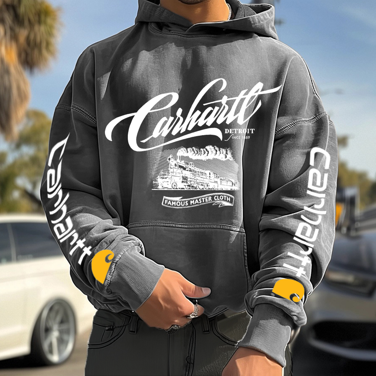 • Design Elements: Vintage-inspired train graphic, vertical lettering on sleeves, hooded design