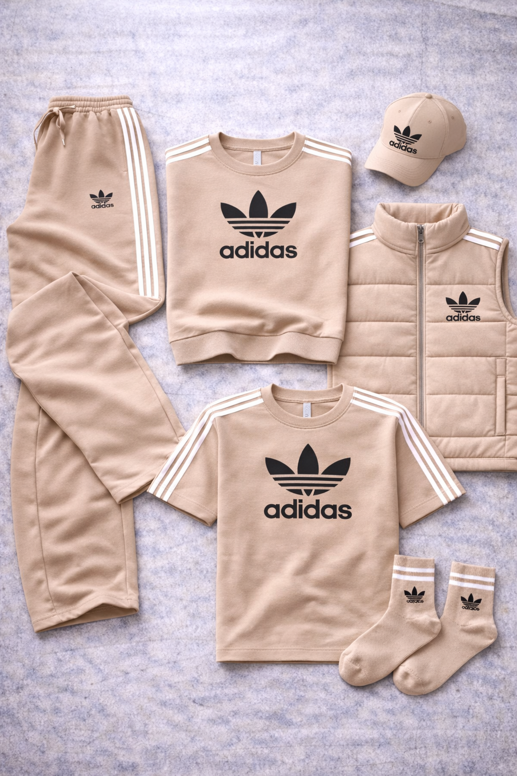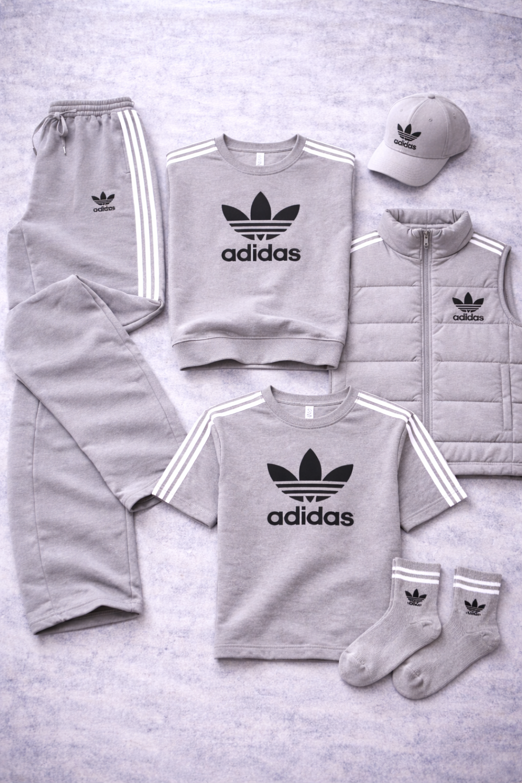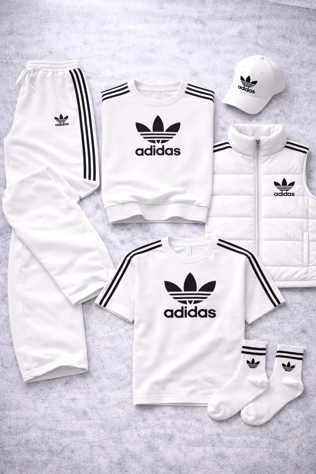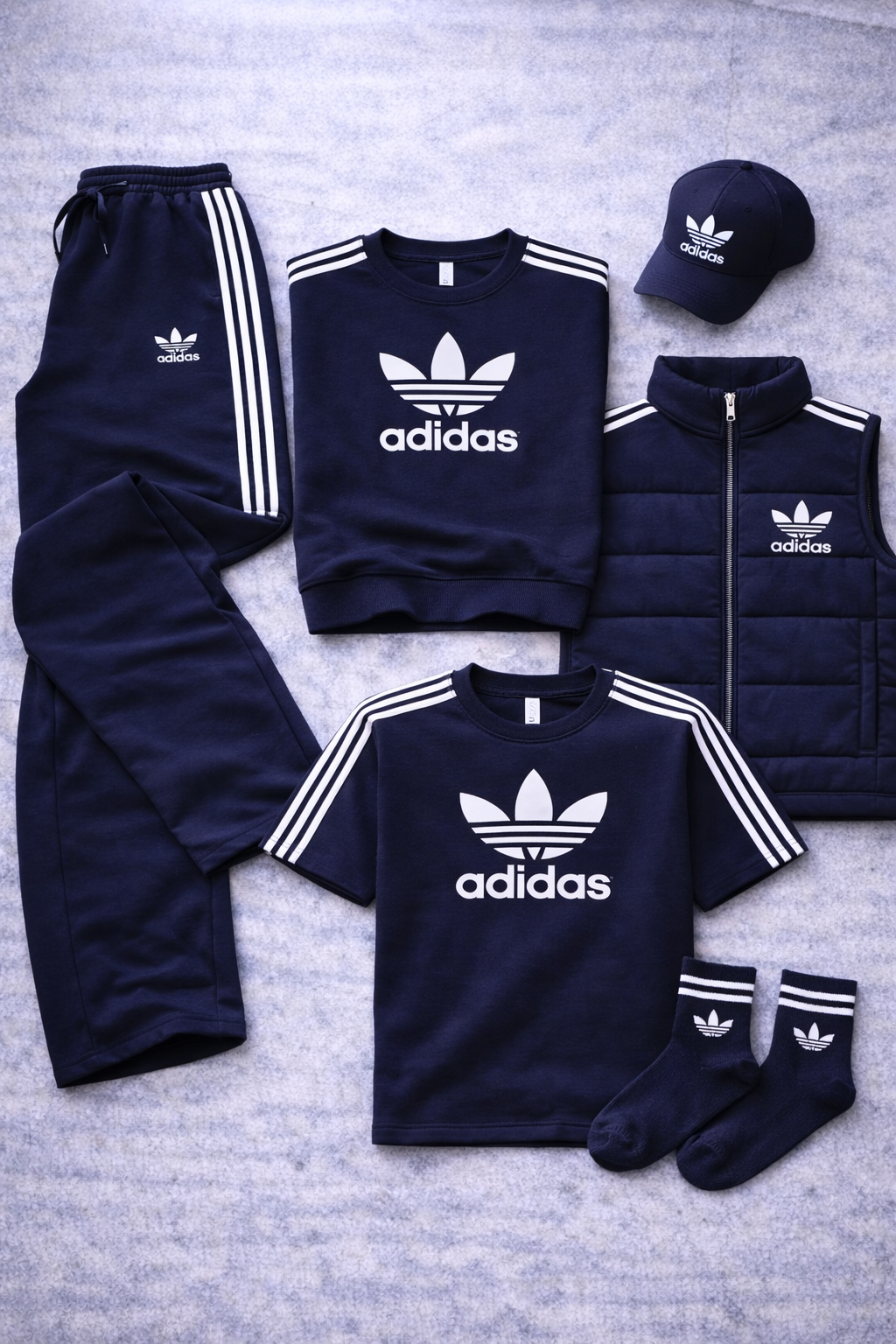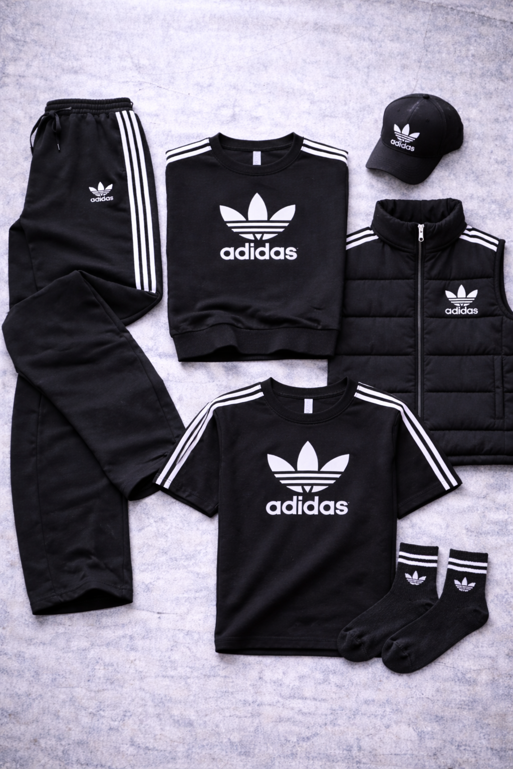 L'Urban Core Set est une tenue Adidas conçue pour ceux qui recherchent un style épuré, affirmé et parfaitement coordonné. L'ensemble comprend un sweat à col rond, un pantalon, un t-shirt, un gilet matelassé, une casquette à visière et des chaussettes, tous pensés pour s'assortir harmonieusement et créer un look urbain complet et instantané.