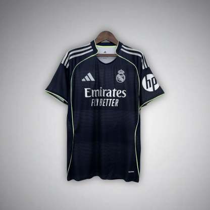 25/26 Real Madrid Away Kit – A refined and modern look inspired by Madrid’s elegance and dominance. Featuring a bold color palette, lightweight performance fabric, and premium finishes. Designed for fans who carry the spirit of Los Blancos beyond the Bernabéu.