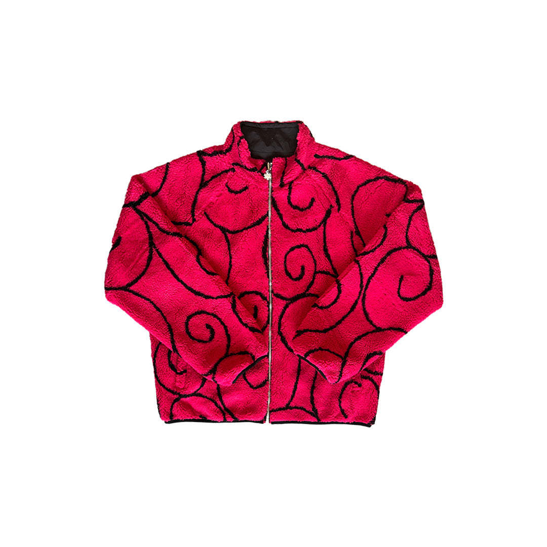OPE is a reversible sherpa jacket with patterns and motifs from a show about a stretchy pirate who wants to be King of the pirates. Featuring an "Op Op" sherpa fleece exterior designed to eliminate the opps with surgical precision, and a nylon interior equipped with double pockets inspired by the Surgeon of Death.