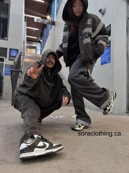 These pants are made of polyester with button pockets on each side. Reflective lines are on the pockets and the bottom of the pants. Embroideries on the front end back. Comes with the keychains on both sides.